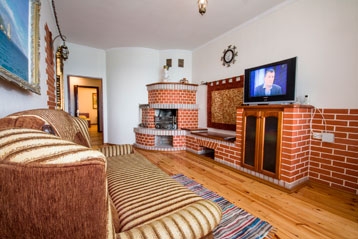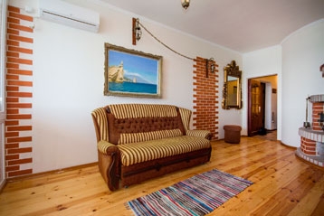 В номере две раздельные коматы. В первой комнате: две односпальные кровати, тумбочка, шкаф, телеизор, кондиционер.Вторая комната: раскладной двуспальный диван, телевизор, камин, кондиционер, выход на балкон с прямым видом на море.