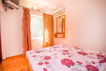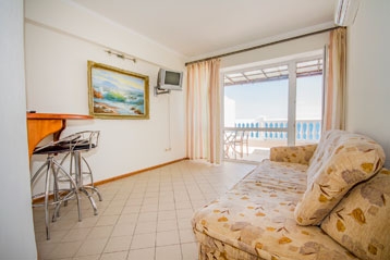Две раздельные комнаты. Большой балкон-терраса с видом на море. 2 кондиционера, 2 телевизора. 2-х спальная кровать, шкаф, двуспальный раскладной диван. Оборудованная кухня: микроволновая печь, электрическая плита, чайник, холодильник, посуда. Санузел с душем.