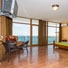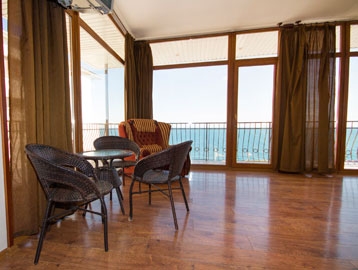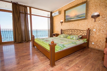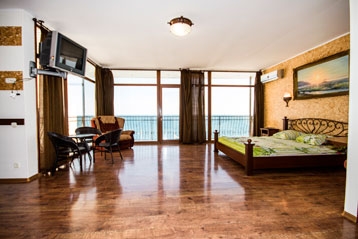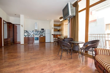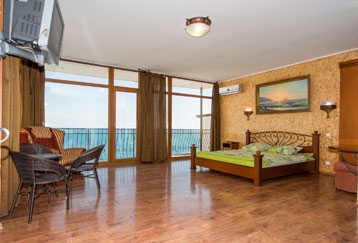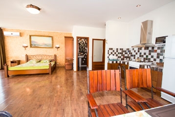 Одная большая комната. Большой балкон с видом на море и горы. Двуспальная кровать, шкаф, раскладное кресло, телевизор, кондиционер. Большая кухня: электрическая плита, микроволновая печь, холодильник, посуда, большая обеденная зона. Санузел с душевой кабиной
