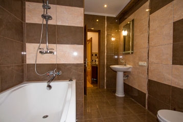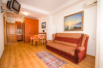 Двуспальная кровать, две односпальные кровати, двуспальный раскладной диван, большой шкаф, две тумбочки, 3 кондиционера и 3 телевизора. Санузел с ванной.
