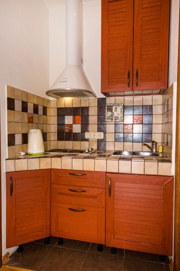 Оборудованная кухня: электрическая плита, микроволновая печь, холодильник, чайник, посуда. Две обеденные зоны.