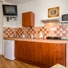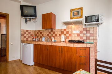 Оборудованная кухня: єлектрический чайник, єлектрическая плита, посуда, холодильник, микроволновая печь.