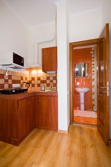 Оборудованная кухня: єлектрическая плита, єлектрический чайник, посуда, холодильник.