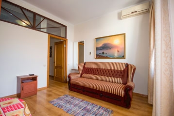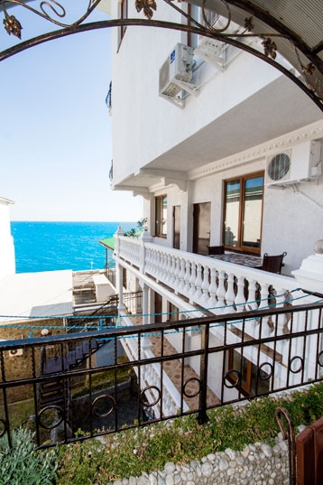 Проходной балкон с видом на море и обеденной зоной. Двуспальный раскладной диван, односпальная кровать, шкаф, кондиционер, 2 телевизора. Санузел с душевой кабиной.